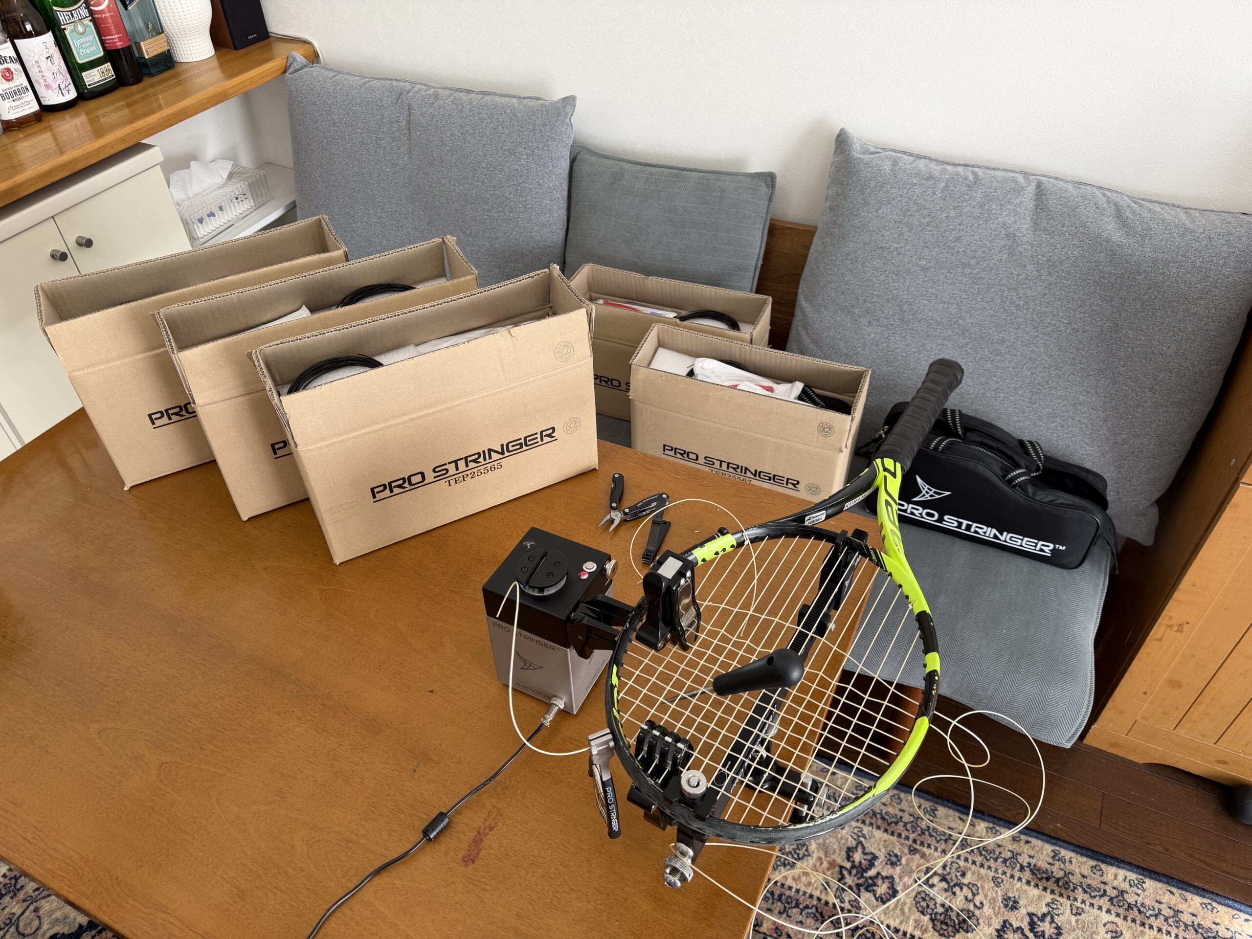 テーブルと電源さえあれば、時間、場所に関係なくストリングの張り替えが可能です。